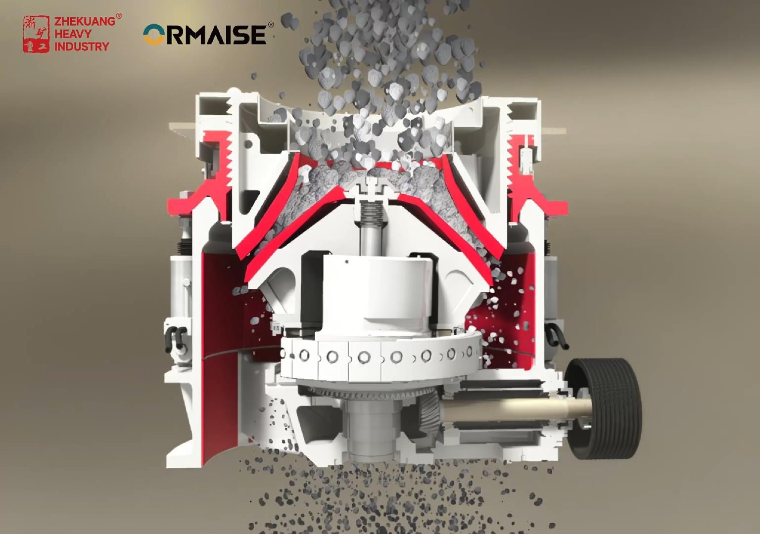 多缸液壓圓錐式破碎機(jī)工作時(shí)動(dòng)錐沿著內(nèi)部偏心軸做旋擺運(yùn)動(dòng),靠近定錐的地方,物料受到動(dòng)錐的擠壓和彎曲而破碎,偏離動(dòng)錐的地方,已破碎的物料由于重力作用從錐底下落,整個(gè)破碎和排料過程沿著定錐和動(dòng)錐之間的破碎腔連續(xù)依次進(jìn)行。機(jī)體外圍均勻分布若干液壓油缸和蓄能器,結(jié)合閥和管路起到過鐵保護(hù)和清理破碎腔的作用。